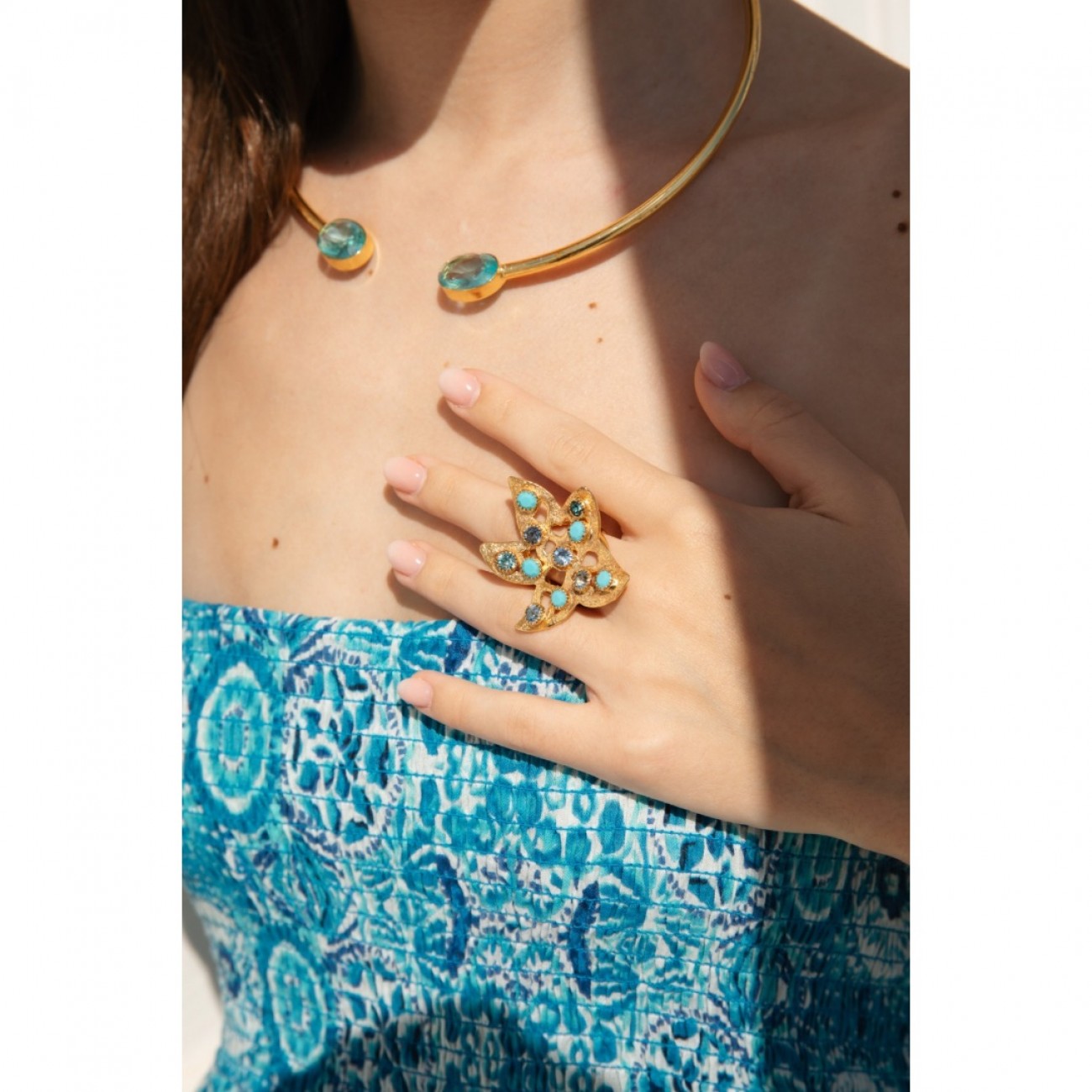 Anello a forma di stella marina in ottone placcato oro con zirconi e pietre sintetiche incastonate.