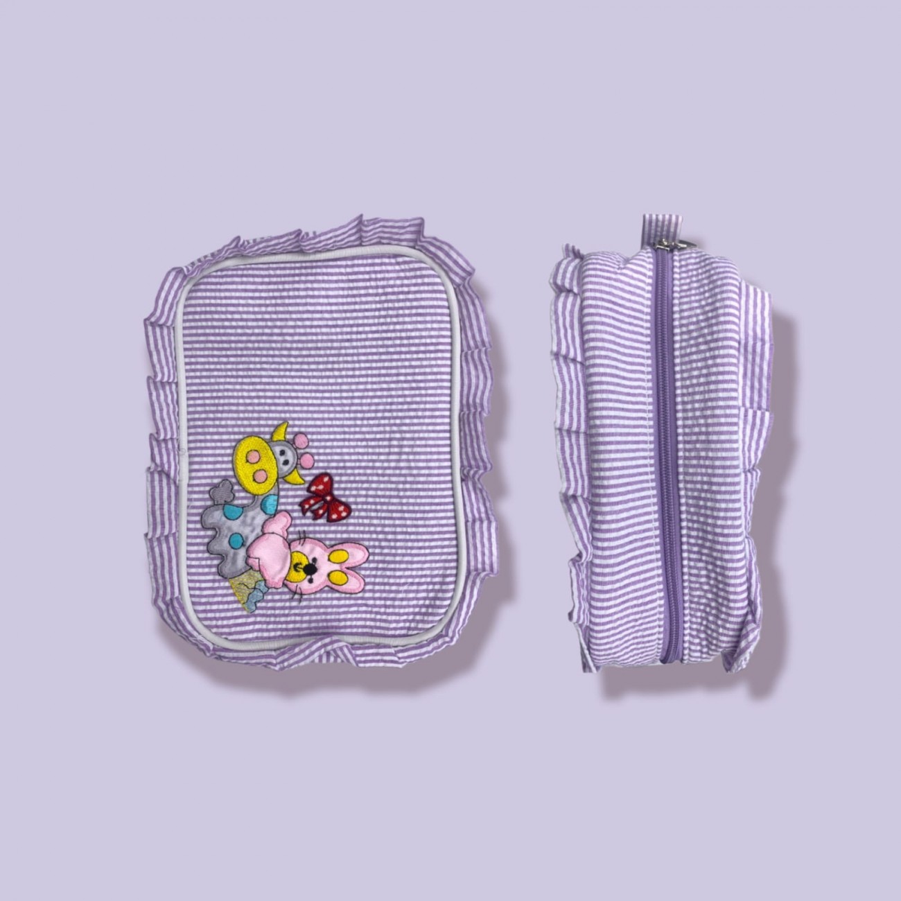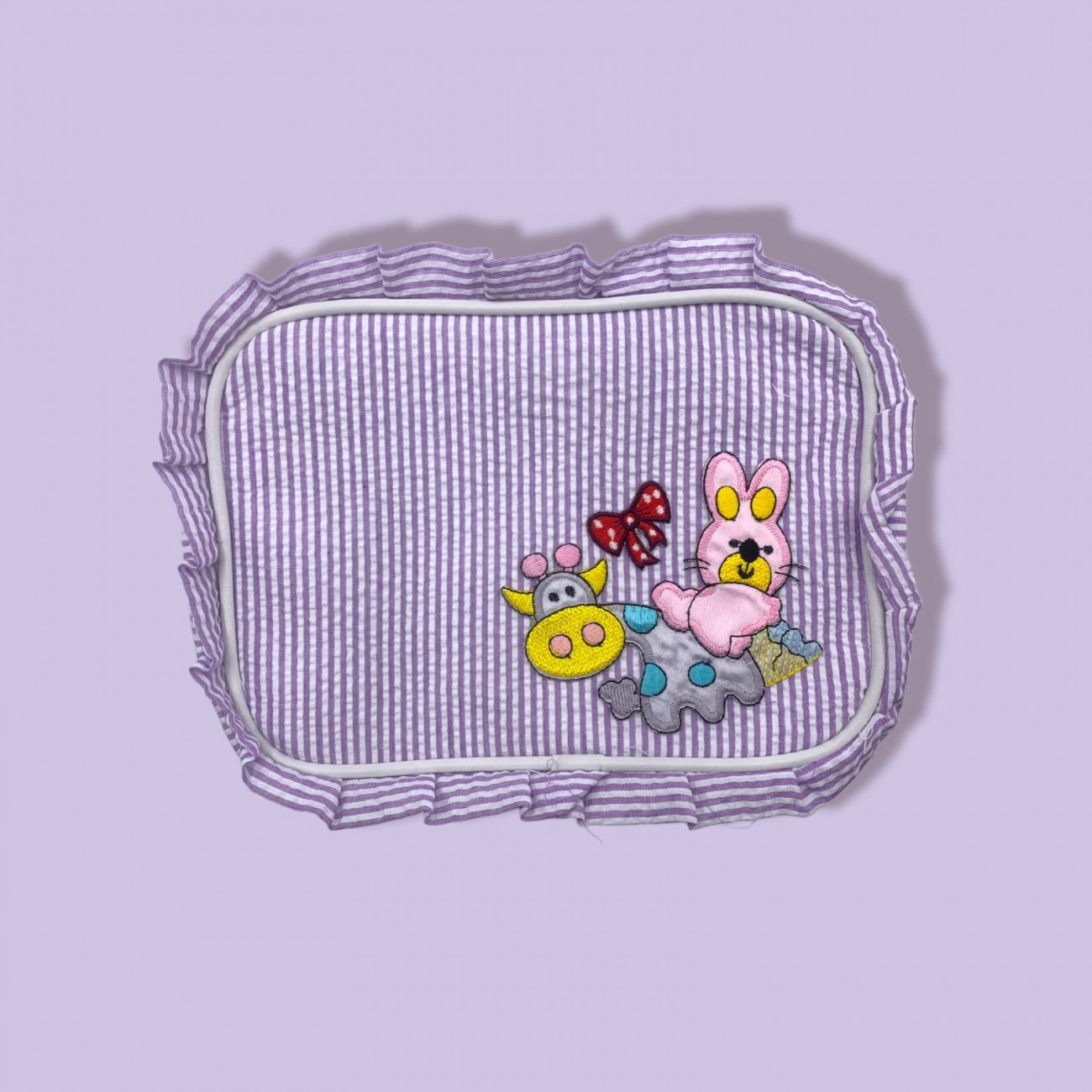 Beuty case per bambine con applicazioni di animaletti a forma di mucca e coniglietto. Internamente impermeabile.